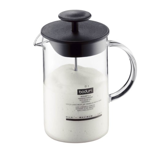 LATTEO Milchschäumer mit Glasgriff. Farbe: Schwarz. Größe: 0,25 Liter. Maße: Tiefe ca. 10 cm x Breite ca. 15,6 cm x Höhe ca. 18 cm. Modell: 1446-01. Mit dem Aufkommen der Kaffee- und Latte Macchiato-Welle hat auch der Milchschaum eine neue Berühmtheit erlangt. Wer sich heutzutage die beliebte Kaffeehaus-Atmosphäre nach Hause holen will, der benötigt nicht nur Espresso sondern auch Milchschaum - ohne ihn wäre der Genuss des Cappuccinos und des Latte Macchiatos nur halb so schön. Mit dem LATTEO Milchschäumer können Sie zuhause perfekten Milchschaum herstellen - und das ganz ohne anstrengende und zeitraubende Handarbeit. Sie müssen nur die gewünschte Menge Milch in den LATTEO Milschäumer einfüllen und wenige Male den Sieb-Stem...