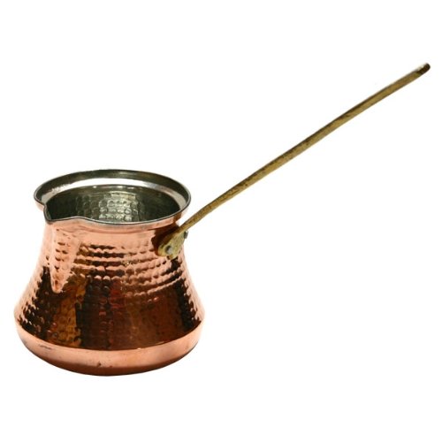 Sehr schöne orientalische Kaffeekanne (Cezve - Dscheswe - Ibrik - Rakwi - Mokkakanne) zum Kochen von arabischem bzw. türkischem Kaffee in Jumbo-Größe. Bei dieser Größe nutzt man die Kanne auch zum Aufkochen von Milch. Die Mokkakanne ist aus Kupfer, und Innen ist eine Legierung. Der Griff ist aus Messing. Die Muster auf der Kanne können von der Abbildung abweichen, da sie in Handarbeit gefertigt werden. Somit ist jede Kanne auch ein Unikat! WICHTIG: Die Cezve werden in Handarbeit und nicht maschinell hergestellt. Daher können sie leicht unebene Böden aufweisen, sodass sie auf Kochplatten etwas wackeln. Traditionell erhitzt man das Wasser in der Dscheswe auf offenem Feuer oder auf dem Gasherd. Dann ist der dünne Boden durchaus funkt...