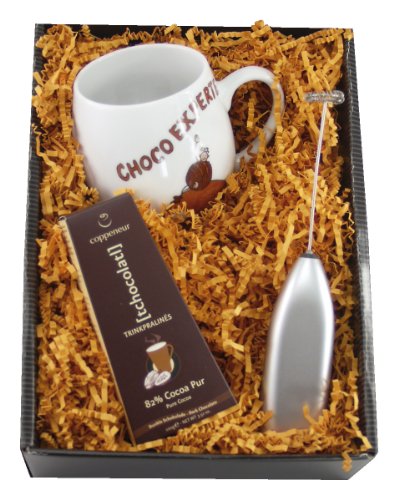 In unseren Kuschelbecher Schoko-Experte passt gaaanz viel heiße Schokolade rein. Die runde bauchige Form schmiegt sich förmlich in die Hand - perfekt, um sich damit bequem in den Sessel oder auf's Sofa zu kuscheln. Die feinen Tchocolatl-BIO-Trinkpralines werden einfach in heißer Milcha aufgelöst bzw. aufgeschäumt. Dabei hilft der quirlige Milchaufschäumer, der nicht nur auf heiße Schokolade steht, sondern auch bei Milchkaffee, Latte Macchiato und Cappuccino voller Freude rotiert. BIO-Trinkpralines 100g, Höhe Porzellanbecher ca. 9 cm, Geschenkbox 18 x 26 x 9 cm Trinkpralines: Dunkle Schokolade (Kakao: 71% mindestens) Zutaten: Kakaomasse, Rohrzucker, Kakaobutter, Kakaopulver. Kann Spuren von Nüssen, Laktose und Gluten enthalten.