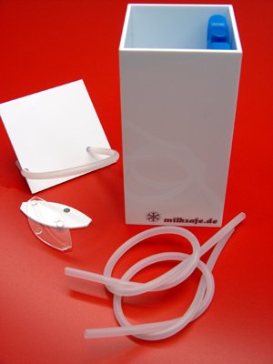 3 Silikonschläuchen, und dem COOLSAFE - ein weißer Behälter aus 3mm starkem, handverarbeitetem Acrylglas.